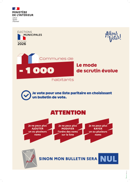 À partir de mars 2026, dans toutes les communes, le mode de scrutin applicable sera donc un scrutin de liste à deux tours, avec dépôt de listes de candidats et suppression du panachage. Ainsi, dans les communes de moins de 1 000 habitants, il n’est plus possible d’ajouter ou de supprimer des noms, ni de modifier l'ordre de présentation des candidats lors du vote.